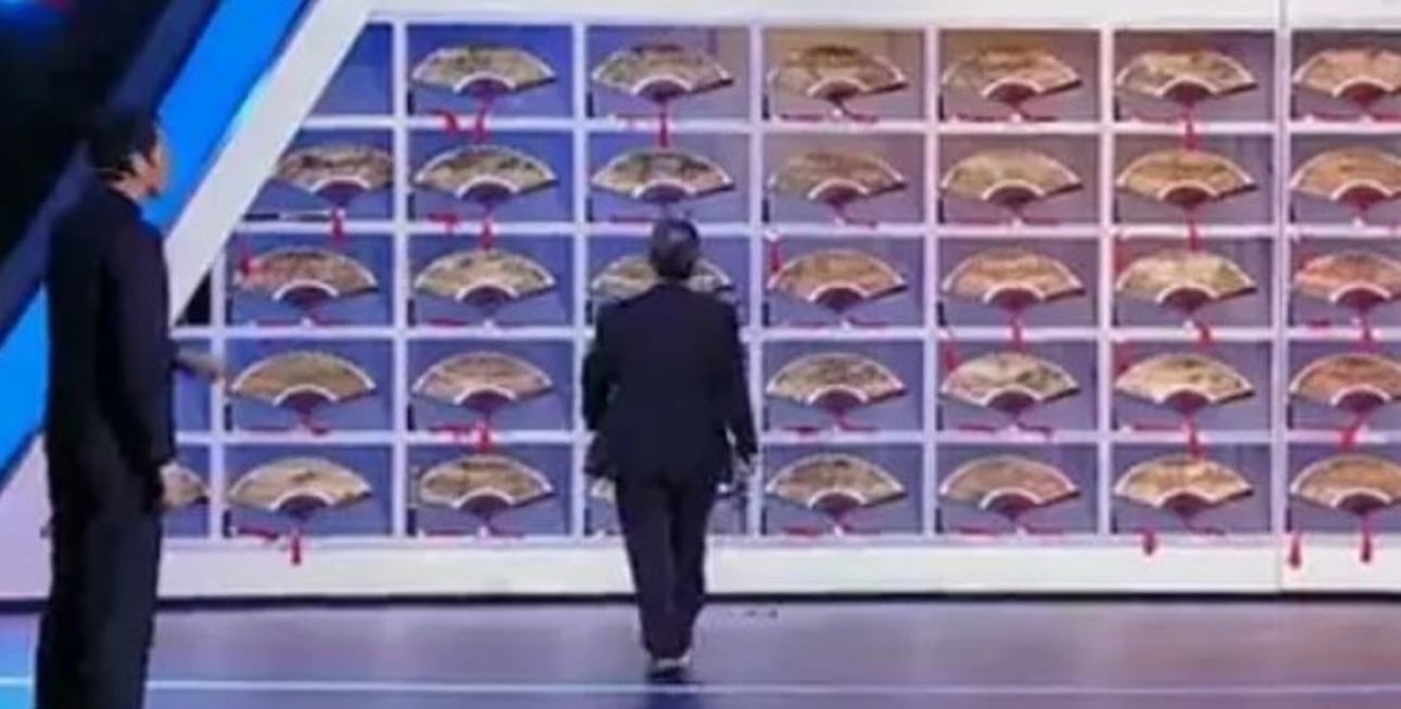 这时王昱珩对战的是日本的69岁老将,两个人的题目是一样的,都是在300把折扇里找出指定的三把。