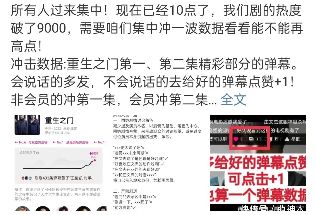 果然剧集刚一上线,粉丝们就开启了卖力营销模式,蹲守视频平台狂刷数据,为了一雪“被迫提档”的前耻。有关《重生之门》的各种热搜也不断出现,粉丝们更是紧盯着实时热度,就连剧集弹幕数量也要控制,着实是煞费苦心。