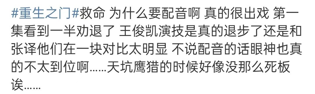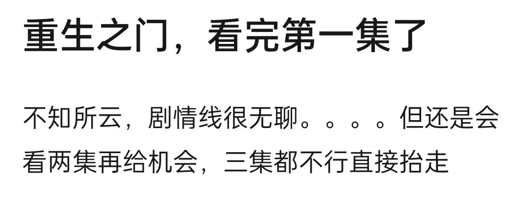 而从真正路人观众们的反馈来看,对《重生之门》的评价褒贬不一。许多观众表示开头看着实在无聊,剧情也没什么吸引力。但也有观众称要坚持下去,后面的剧情可能会更精彩。
