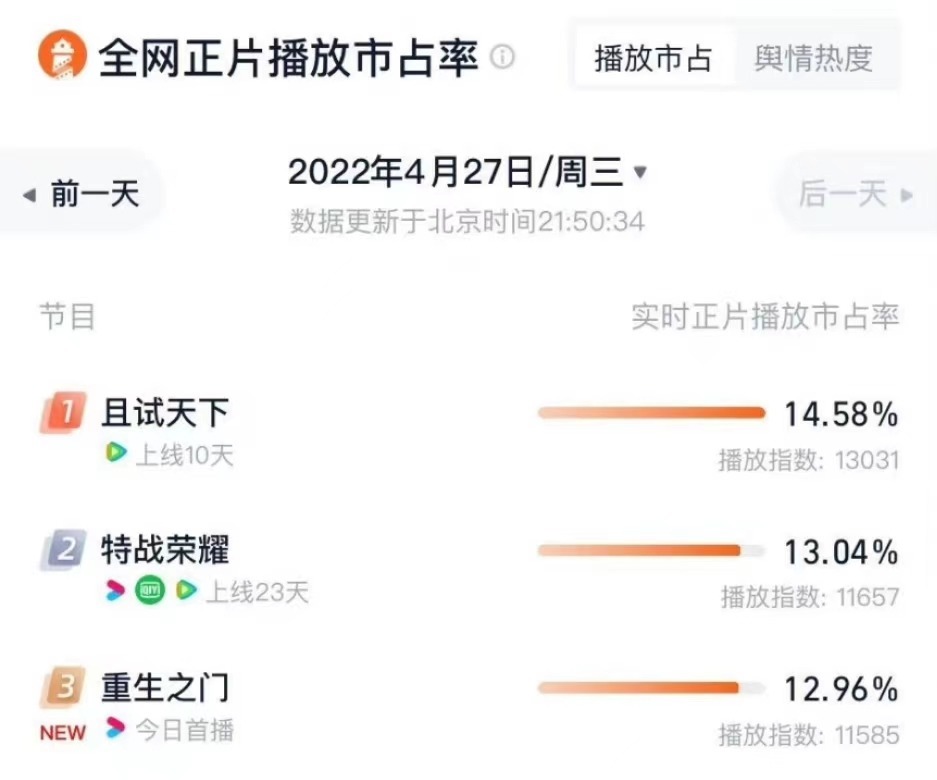 在此般卖力营销下,《重生之门》首播热度确实足够,可播放方面却还是没能冲击到已经开播多日的两部剧,屈居其后稍显遗憾,可见也不是所有数据都能靠“刷”。
