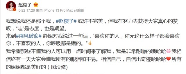 之后,赵樱子发文拉好感,并放出与各位姐姐的合照,力证自己的好人缘。不知这种方式能否为她助力呢。