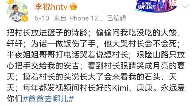 近日,因天天早恋的原因,《爸爸去哪儿》多个萌娃都被拉出来,连登热搜。就连曾在节目中陪伴过萌娃们的“村长”李锐,都特意通过个人平台发文回忆和宝贝们共同度过的温暖时光。