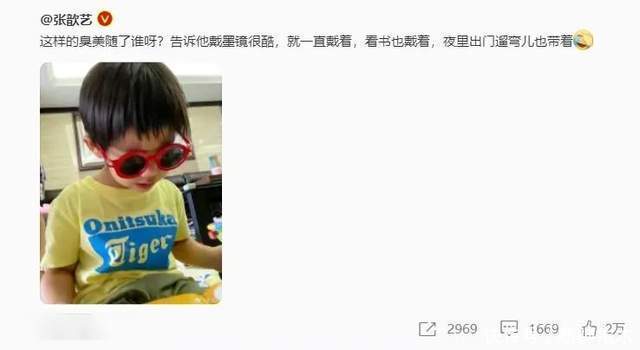 张歆艺经常在社交平台分享儿子趣事,四坨五官和爸爸相似。四坨小小年纪就特别臭美,情商也很高,是出了名的搞怪男孩。参加《爸爸去哪儿》的四坨很有可能金句频出,创造各种名场面。