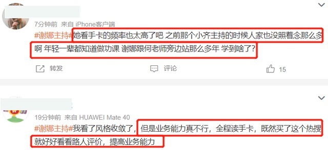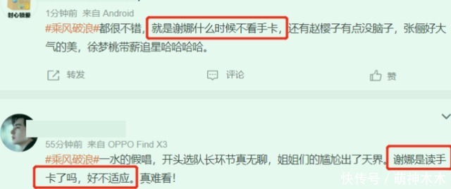 接下来,在姐姐们表演间隙出来串场主持的谢娜还是离不开手卡,看到她穿着礼服站在舞台上把手卡举高垂着眼睛读的样子,确实让人观感不佳。