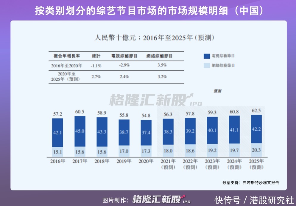 据格隆汇分析,到2025年时,电视综艺节目市场恢复增长至422亿元,网络综艺节目市场将达到203亿元。尽管从市场未来预期来看,想象空间较大,但整个行业高度分散,很难形成规模。2020年,前五大独立制作商及运营商的市场份额仅有5.5%,这也意味着,现在内容制作的竞争非常激烈。对于星空华文来说,公司的综艺节目IP能否火爆具有太多不确定性。