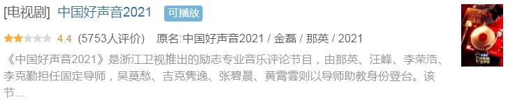 但2021年8月13日《中国好声音2021》在浙江卫视播出后,在酷云实时收视率仅为0.9%。公众口碑也同步下滑。据豆瓣显示,《中国好声音2021》评分仅为4.4分。相比2012年开播第一季时的高收视与高口碑相去甚远。