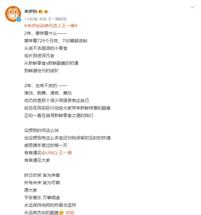 但是在近日来伊份却发长文似乎是在告别,最后更是提到了:昨日欢笑 皆为序章所有未来 皆为可期!而在评论区也是放出“临别小赠礼”,里面则是以前一些王一博的宣传视频。