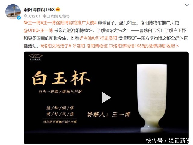 该文还配上了一条一分多钟曹魏白玉杯的讲解视频,讲解人正是王一博。在王一博的带领下我们看到了精美的古杯,也认识到了我国历史文化的悠久和内涵。