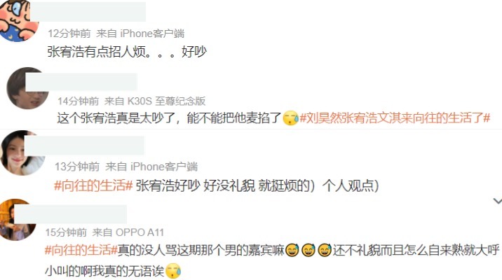 也是没想到这一季一开始来了三个嘉宾都是小辈,却出了一个堪称《向往》6季以来最没“礼貌”的男嘉宾,直播弹幕和网友反馈都纷纷表达不满——这位叫张宥浩的95后男演员,被吐槽全程口无遮拦,似乎有点聒噪有点吵有点没教养呢……