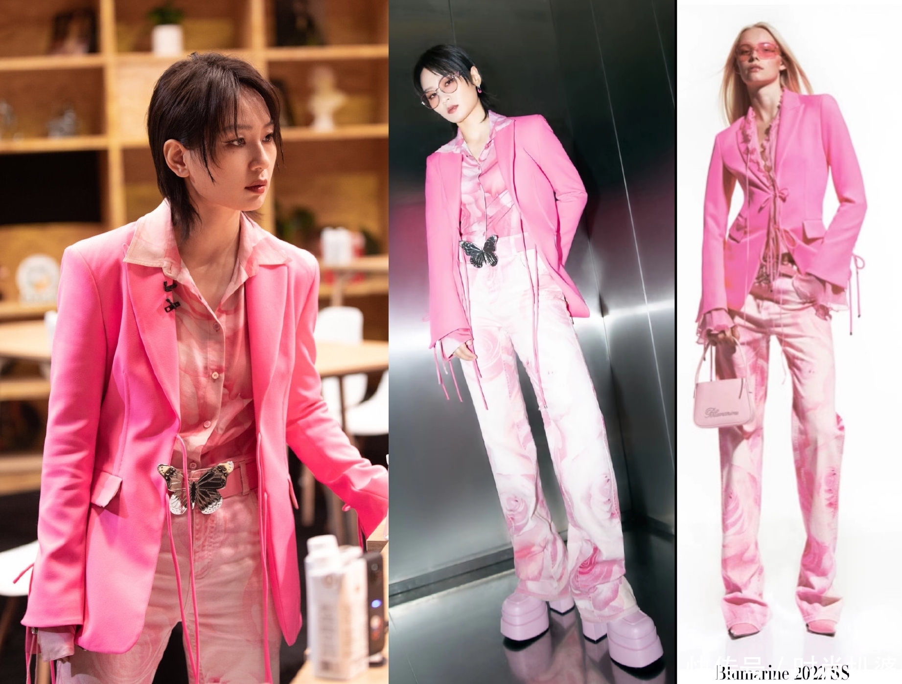 再来看看新生代歌手们的造型。在时尚资源方面一向不俗的周笔畅两套造型都是西装,但造型风格截然不同。先导片里穿了一套来自最近两年很火的千禧风品牌Blumarine2022春夏系列的粉色look,搭配Versace很火的防水台高跟鞋,一身都是当下爆红的元素,在她身上意外不显腻~