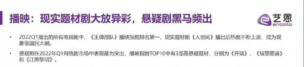 此前,知名统计网站艺恩就发布了2022年第一季度上线电视剧播映指数前十的榜单,让我们一起来看看前十的榜单中有没有你喜欢的电视剧吧!