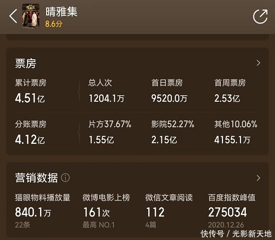 那么说回到《晴雅集》,前文提到过,算上联合出品,这部电影共有15家出品公司,如果新经典影业能分到2423.2万,那么电影总票房收益至少应该在一亿上下吧!但从平台给出的数据来看,电影累计票房共4.51亿,片方分账1.55亿,《晴雅集》拍摄成本5500万几乎是不可能的,那么怎么会有1亿的利润呢?而且受疑似禁映影响,原计划《晴雅集》下部《泷夜曲》能否上映也成了未知数,《晴雅集》也没能在线上播出,意味着没能卖网播的版权,所以电影有这么高的收益几乎是不可能的,这很可能就是禾和影业和新经典影业纠纷的核心。