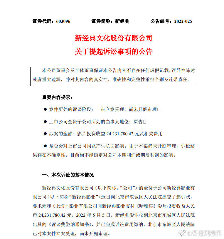 5月6日晚,上市公司新经典文化股份有限公司发布公告,内容为全资子公司新经典影业近日提交起诉状,要求禾和(上海)影业有限公司向新经典影业支付《晴雅集》影片投资收益2423.2万元。