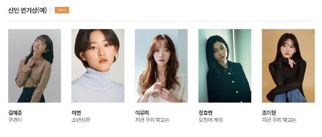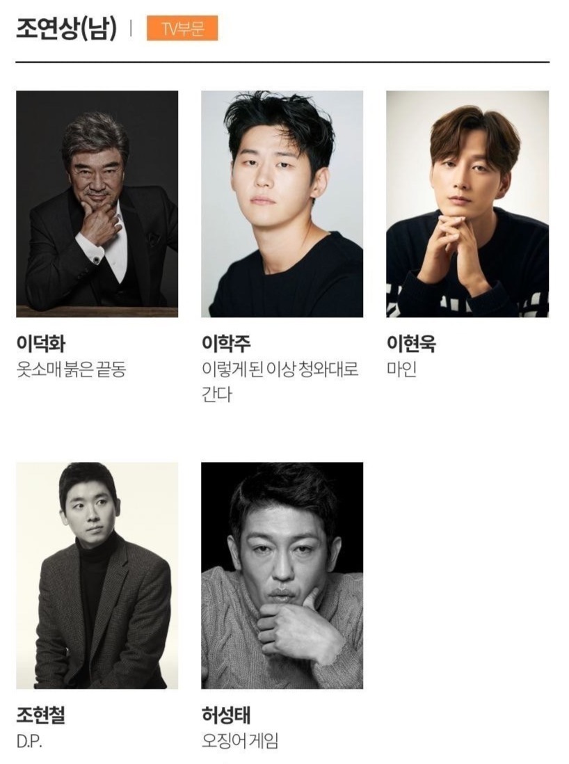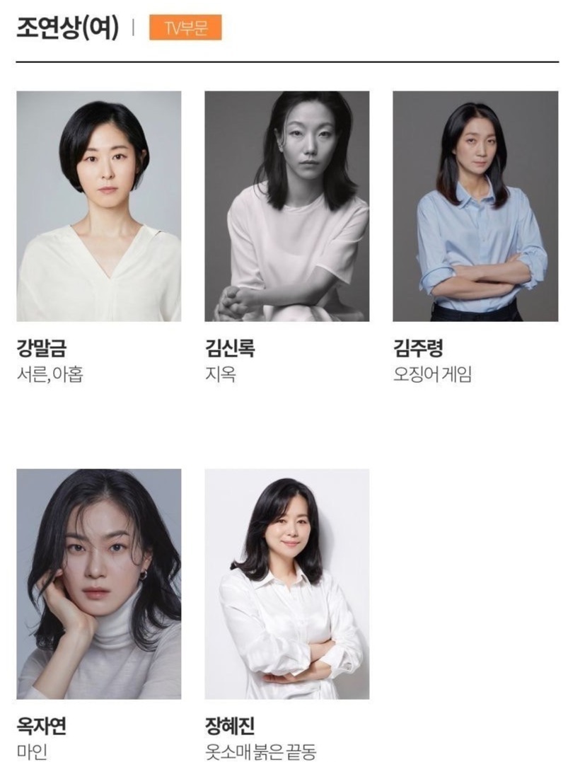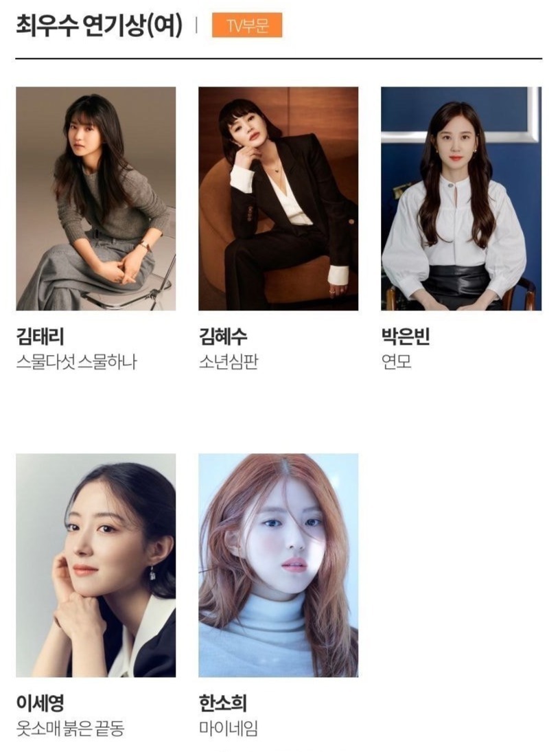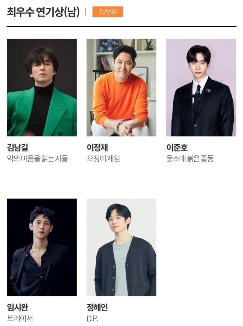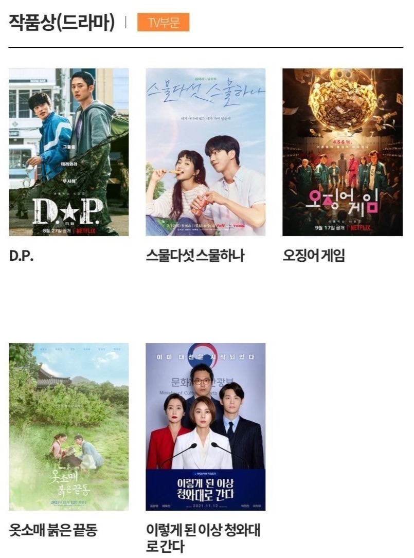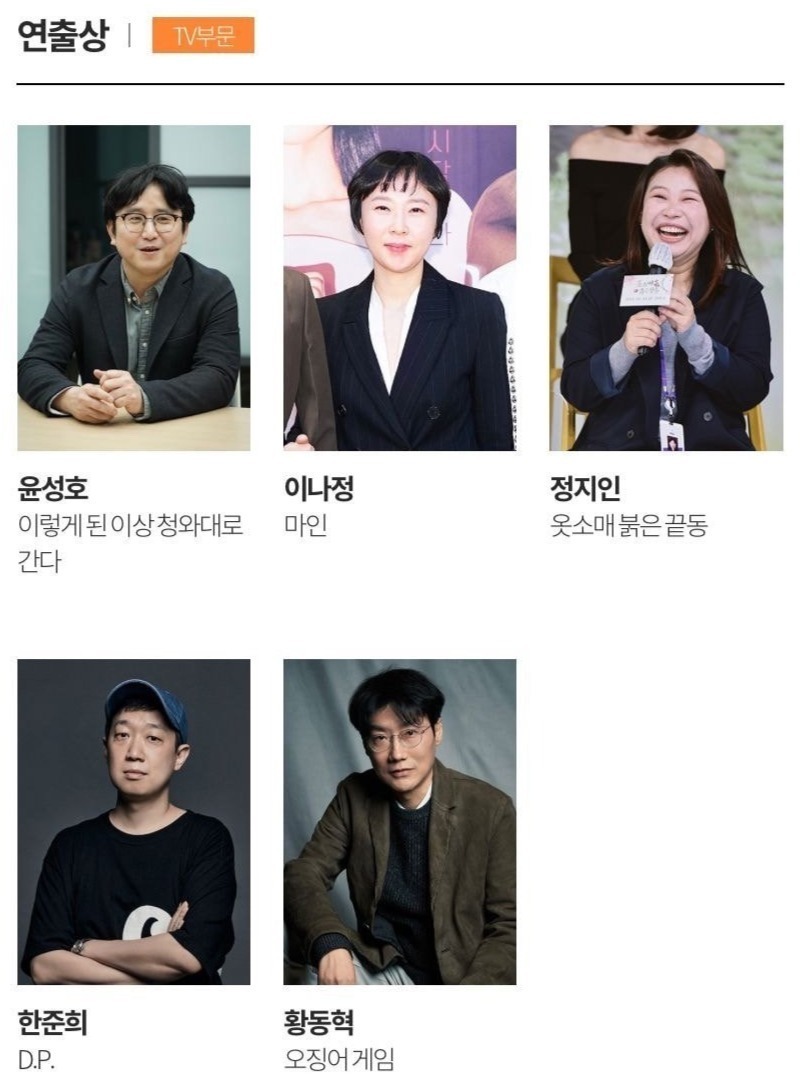 电视类中《鱿鱼游戏》以最佳作品、最佳导演、最佳男主在内的七项提名领跑。李政宰、任时完、丁海寅等入围视帝,金泰梨、金惠秀、韩素希等角逐视后。