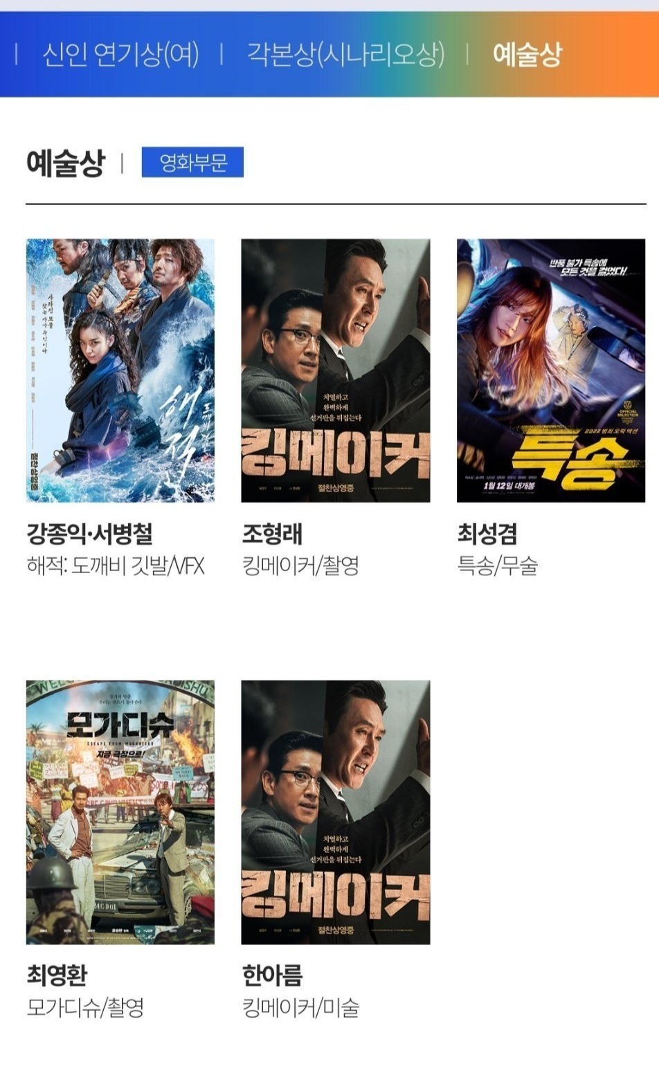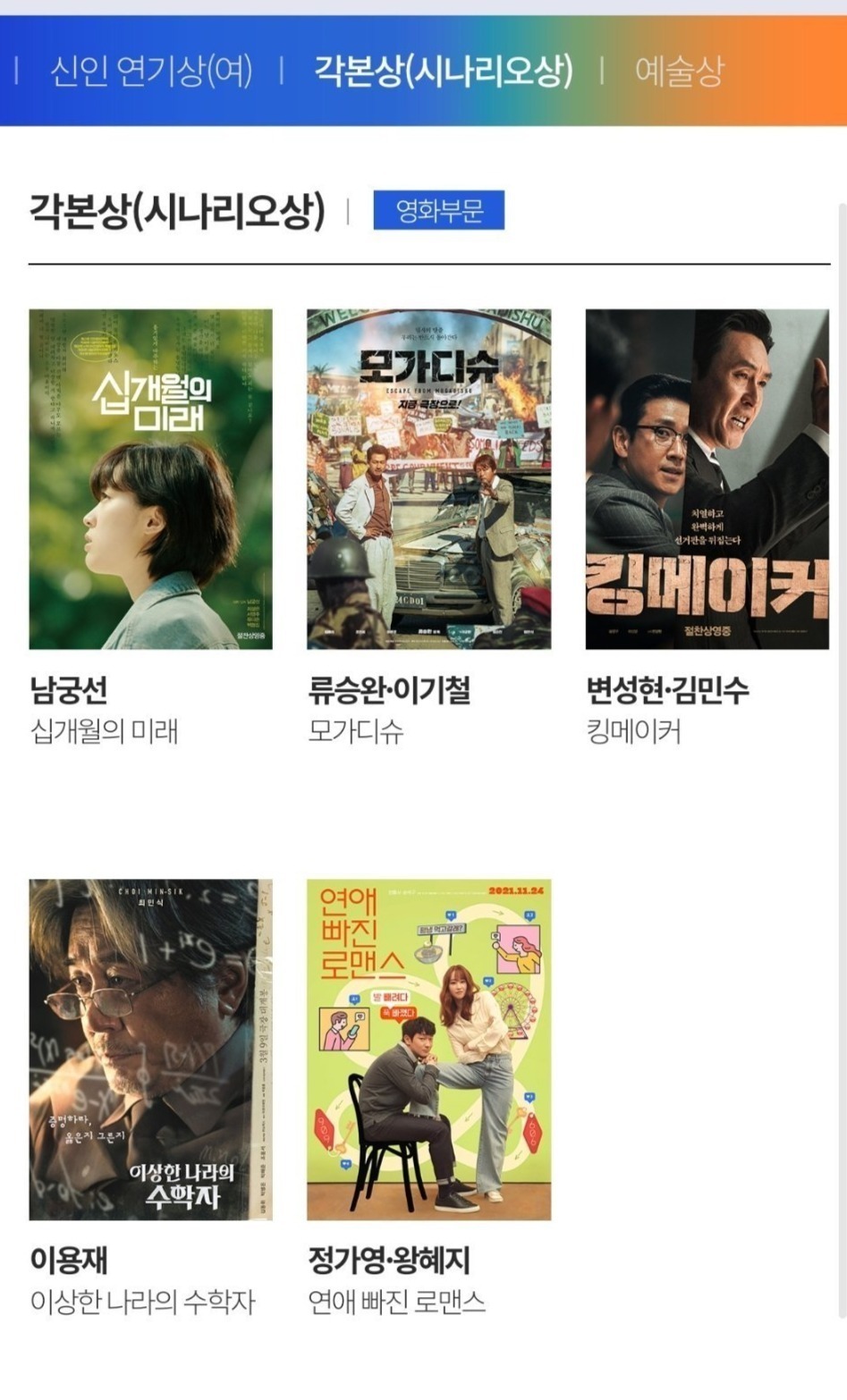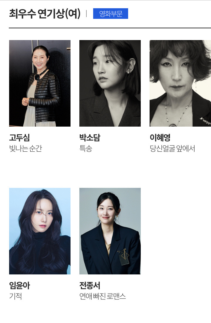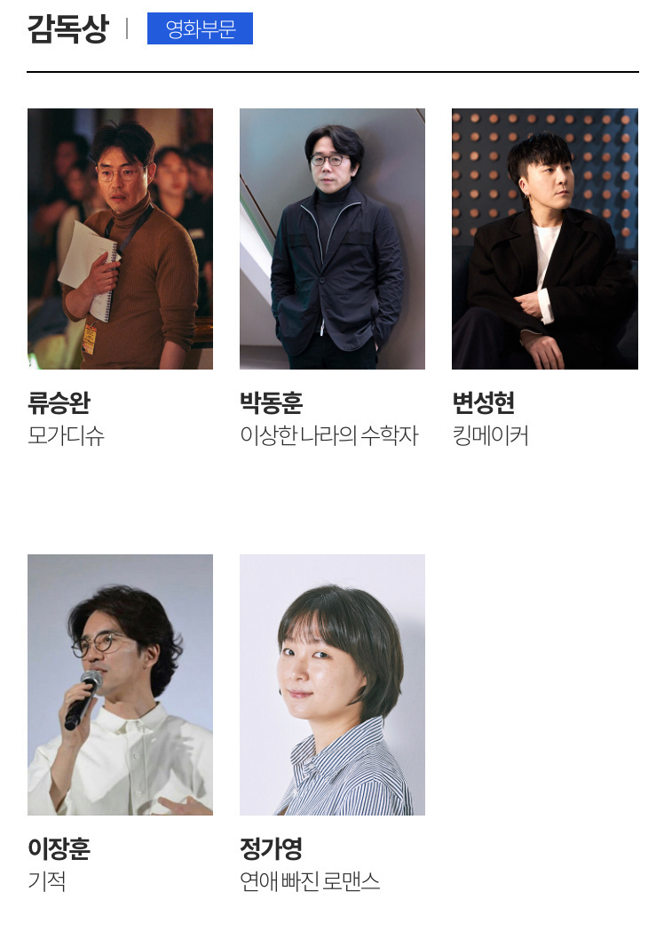 电影类中《摩加迪沙》和《造王者》以最佳电影作品、最佳导演、最佳男主在内的八项提名领跑。薛景求、崔岷植等入围影帝,林允儿、全钟瑞等角逐影后。