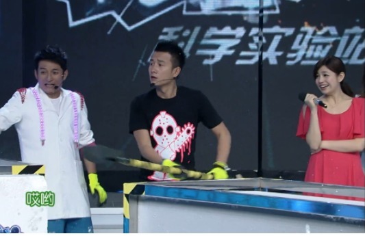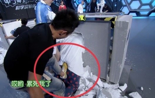 当时何炅和维嘉一组,文章和杜海涛一组。由于何炅的身材瘦小,所以很快就钻过了泡沫板。