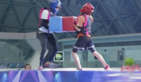 节目中有一个名叫“黑暗擂台”的游戏,双方在浮板上拿着泡沫锤攻击对手,直到一方落水就算胜利。