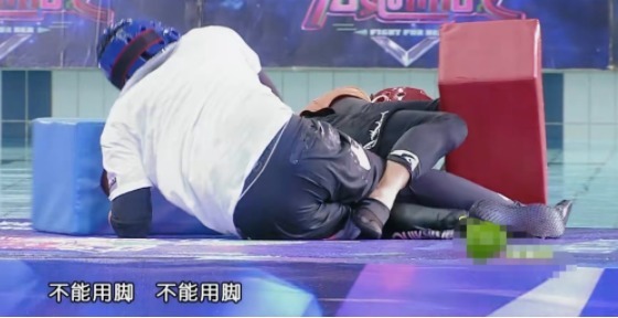 而杨威本人也丝毫不顾及规则,全程都用脚缠着张智霖的双腿。