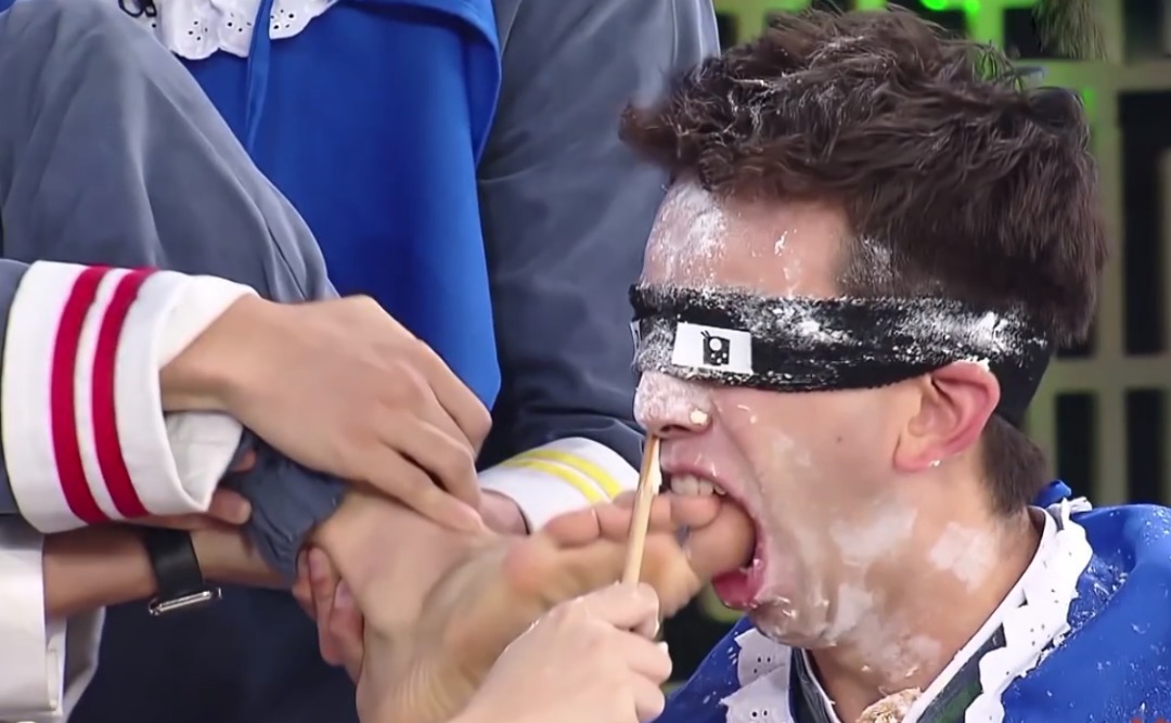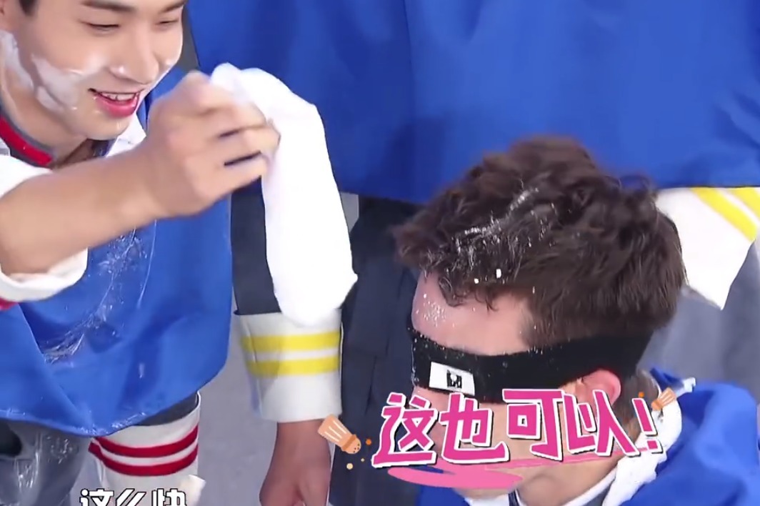 其他人见状都拦着刘宪华,但他本人却越玩越起劲,最后直接用脚趾沾上面粉送到了MIKE隋的嘴里。