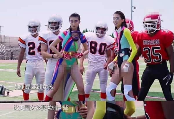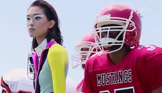 当时,为了出片效果更好一点,蔡羽特意让一边的橄榄球运动员把钱凯丽托举起来。