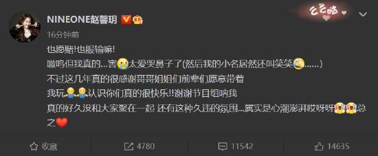 节目播出后,乃万发博表示愿赌服输,自嘲自己太爱哭鼻子了,“不过这几年真的很感谢哥哥姐姐们前辈们愿意带着我玩,认识你们真的很快乐!”