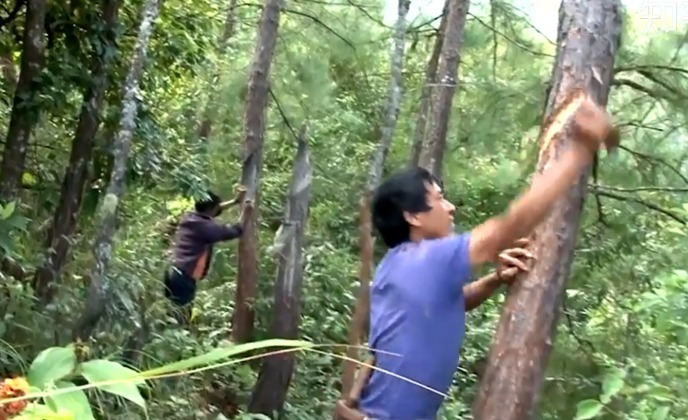 家中唯一的经济来源靠爸爸去山上采松脂,每逢周末,懂事的吴宗宏也会前去帮忙。