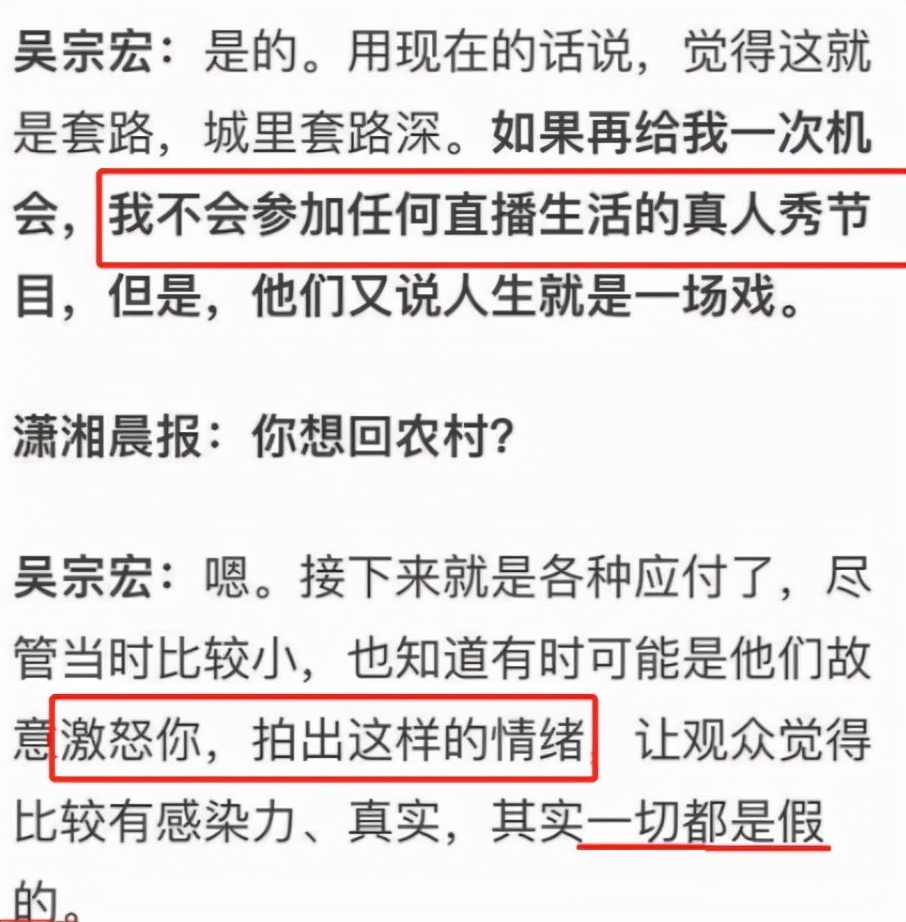 谈及曾经参加过的节目,吴宗宏表示一切都是虚幻的,是人为制造的效果。