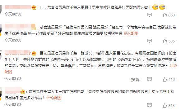 4部影片都非常优秀,除了易烊千玺外也有多位合作演员入选,比如袁泉、张涵予、周也、齐溪、朱亚文、胡军等。