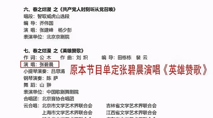 本来央视春晚原定由张碧晨演唱《英雄赞歌》,甚至都录好了节目了,结果消息曝光之后,官方直接把张碧晨踢出了表演名单。