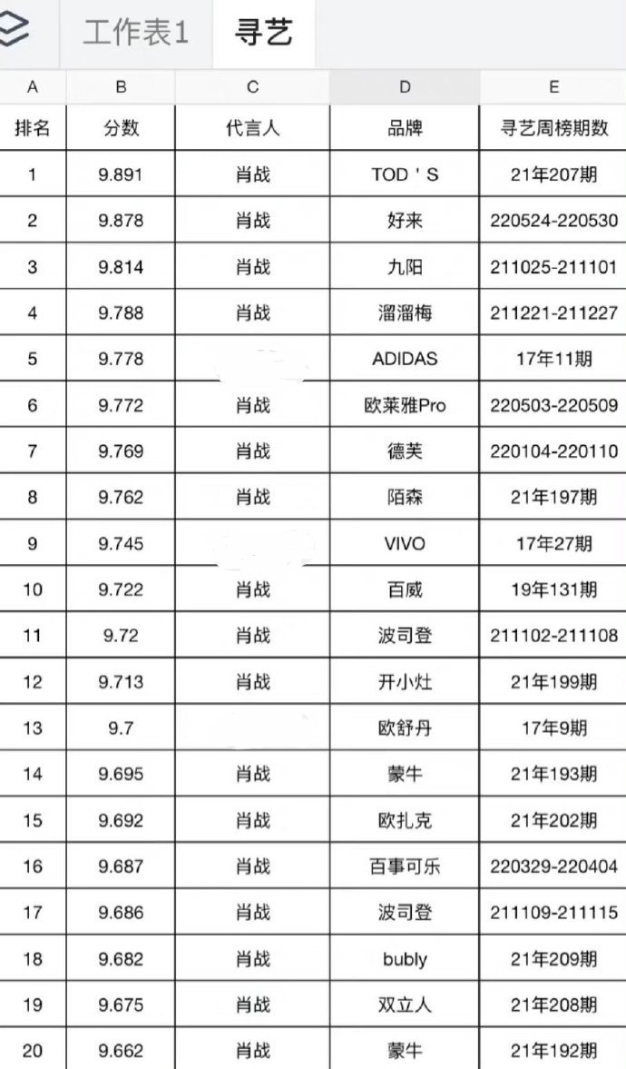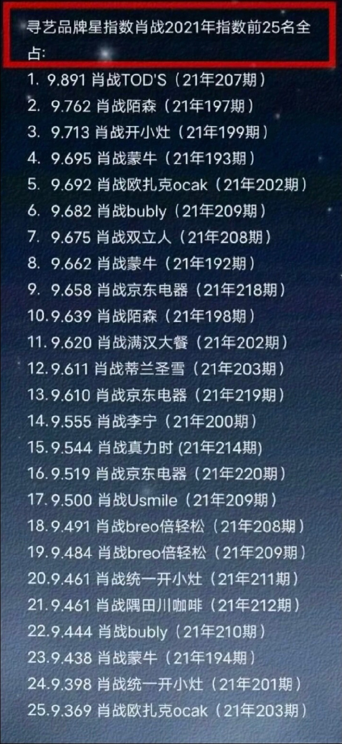 若问肖战有多牛气?传言为虚,眼见为实,让我们用数据说话。在权威榜单寻艺品牌星指数“有史以来”的TOP20中,肖战一人独占18位,而在该指数2021年前25名,肖战直接一统江湖,全占。此等声势那叫一个霸气,无敌,让人彻底没脾气。肖战用实打实令人震撼的数据向世人证明:谁是商务王者。