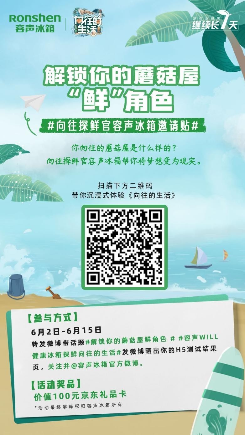 “向往探鲜官”容声冰箱不仅为蘑菇屋吃货储存美味,还为粉丝们解锁新福利,想成为蘑菇屋家族的一员吗?想知道来到蘑菇屋你会成为谁吗?快来随容声一同揭晓你的蘑菇屋身份吧!不要忘记锁定每周五22点《向往的生活》第六季,一起期待更好的生活吧~