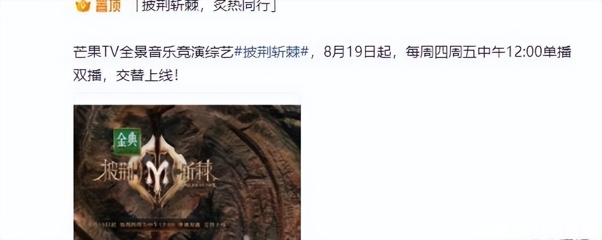 《披荆斩棘》将于8月19日起,每周周四周五中午单播双播。粉丝看到这则消息后,颇为激动,毕竟在影视圈像《披荆斩棘》《乘风破浪》这种作品真的不多。