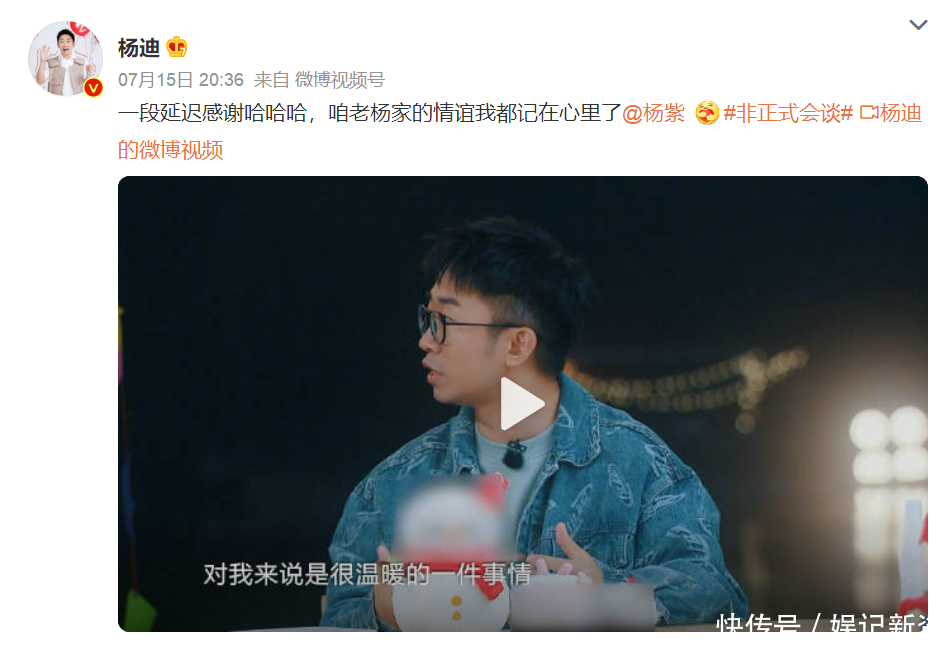 7月15日,杨迪发文感谢杨紫,揭开了一段综艺中网友们都不知道的“内幕”,也让网友们看到了杨紫的“真面目”,她纯真善良的一面。