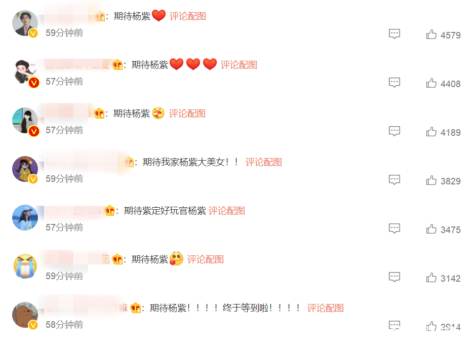 不但能看到杨紫,还能听到杨紫唱歌,这也太幸福了吧。真的是太期待了,好希望节目快点开播,让我们能够看到“新鲜”的杨紫。粉丝们看到后也直呼杨紫,期待她的出现。