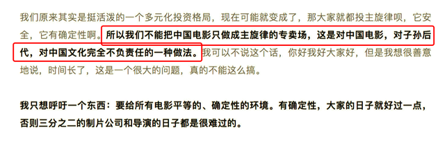 其实针对主旋律电影,导演贾樟柯此前曾用非常犀利的言语评价过。电影市场的投资本来就是一个多元化的格局,但是现在逐渐变成了大家都投资主旋律电影,因为它安全稳定。但是这样的操作是不利于市场发展的,如果把电影只做成主旋律的专卖场,对中国电影市场是不负责任的,同时对中国文化也是一种不负责任的做法。