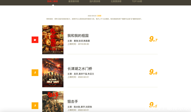 其实目前主旋律的电影中,不乏一些叫好又叫座的电影,根据专业票房统计网站公布的数据,能看出来目前口碑榜前三的都是主旋律电影,其中《我和我的祖国》这部电影稳居第一,在票房与口碑上都非常不错。