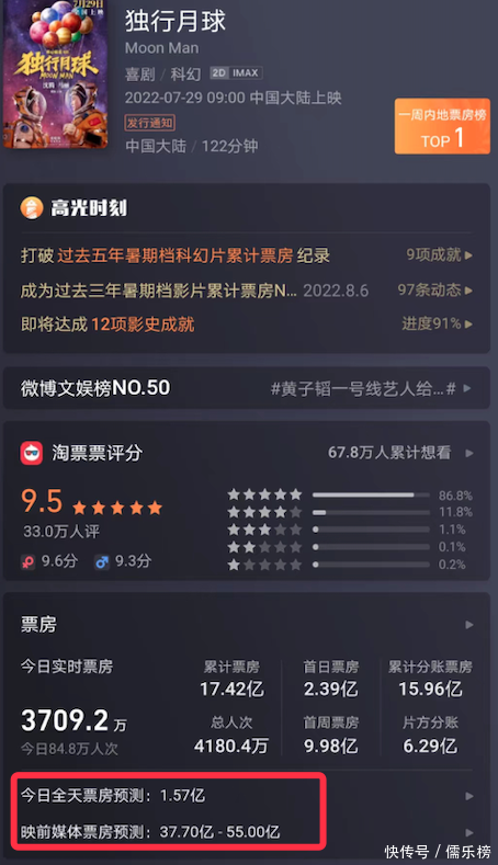 而对于现正热映的《独行月球》却放出了将超越《长津湖》成为票房冠军的预期,所有的媒体都称该片至少要达45亿以上。但是依照《独行月球》现在的口碑,儒爷认为该片最终可能在35亿左右。可见现在的媒体对于国产片的预期比港产片要高出太多了。