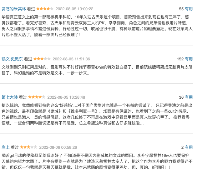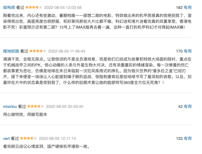 随着电影的上映,该片的首波口碑也新鲜出炉。毫不意外,四五星好评全给了特效,「机甲科幻特效巨制」、「特效是目前国内最高水准」、「好莱坞式科幻爽感,不枉多年的期待」,看得出观众对整体制作的评价相当高。也难怪网友们称该片是继《流浪地球》之后,最像样的科幻片了,也没有辜负那个「中国首部科幻硬核爽片」的口号。