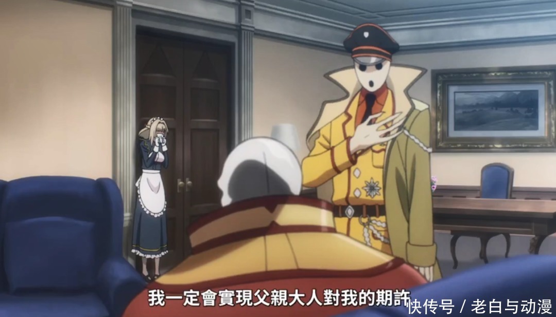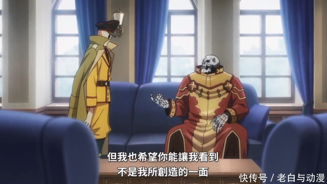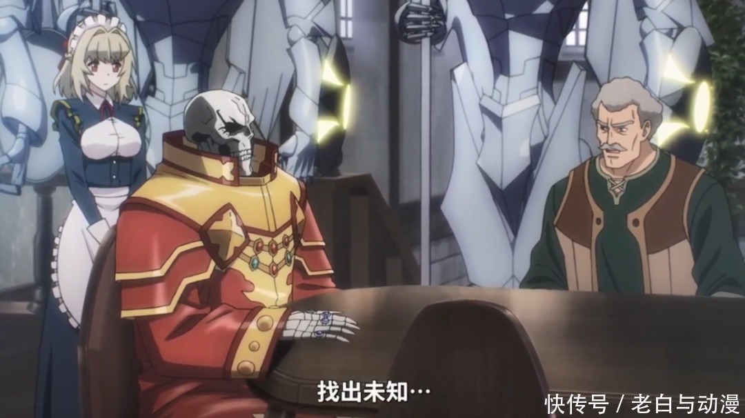 在动画第一集,给我们介绍骨王的日常,比如服装这一块,穿着太华丽了,还被骨王吐槽,但是碍于部下们都喜欢,骨王也不好拒绝,因此只好穿上这套衣服开始一系列办公,为建设魔导王国而努力。