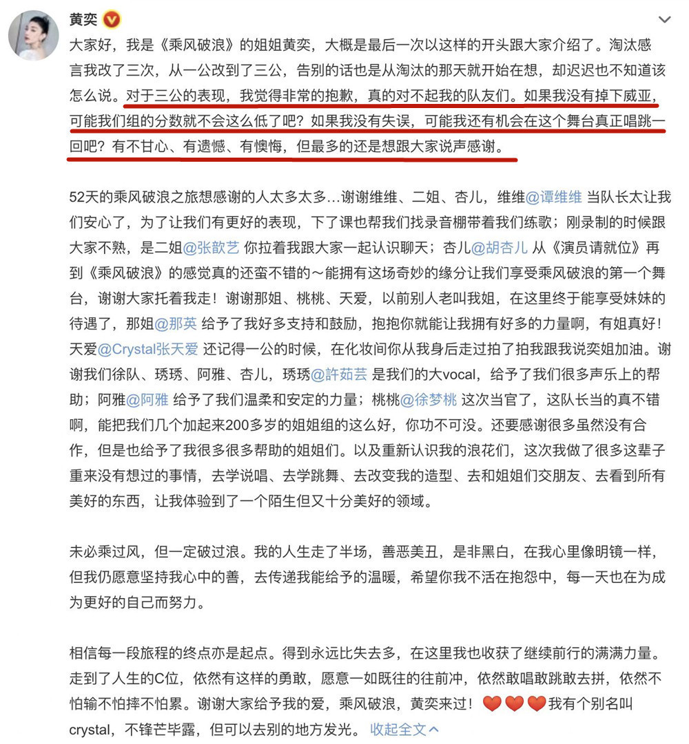 在节目播出后,黄奕发自责长文,可见她对这场表演的重视。