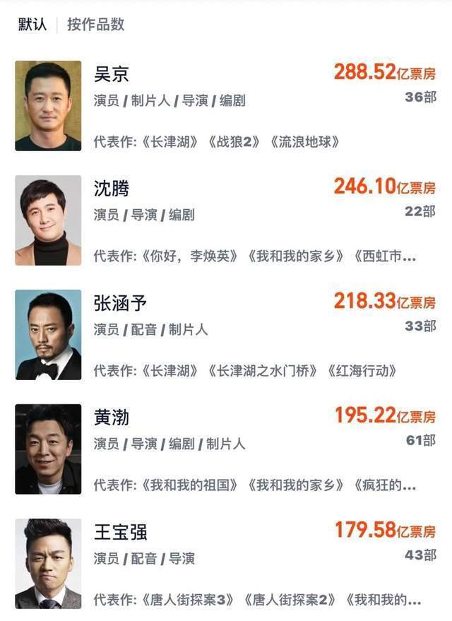 另二位(吴京、张涵予)的票房成绩,则是一个一个硬汉形象、一部一部动作片/战争片累积起来的。